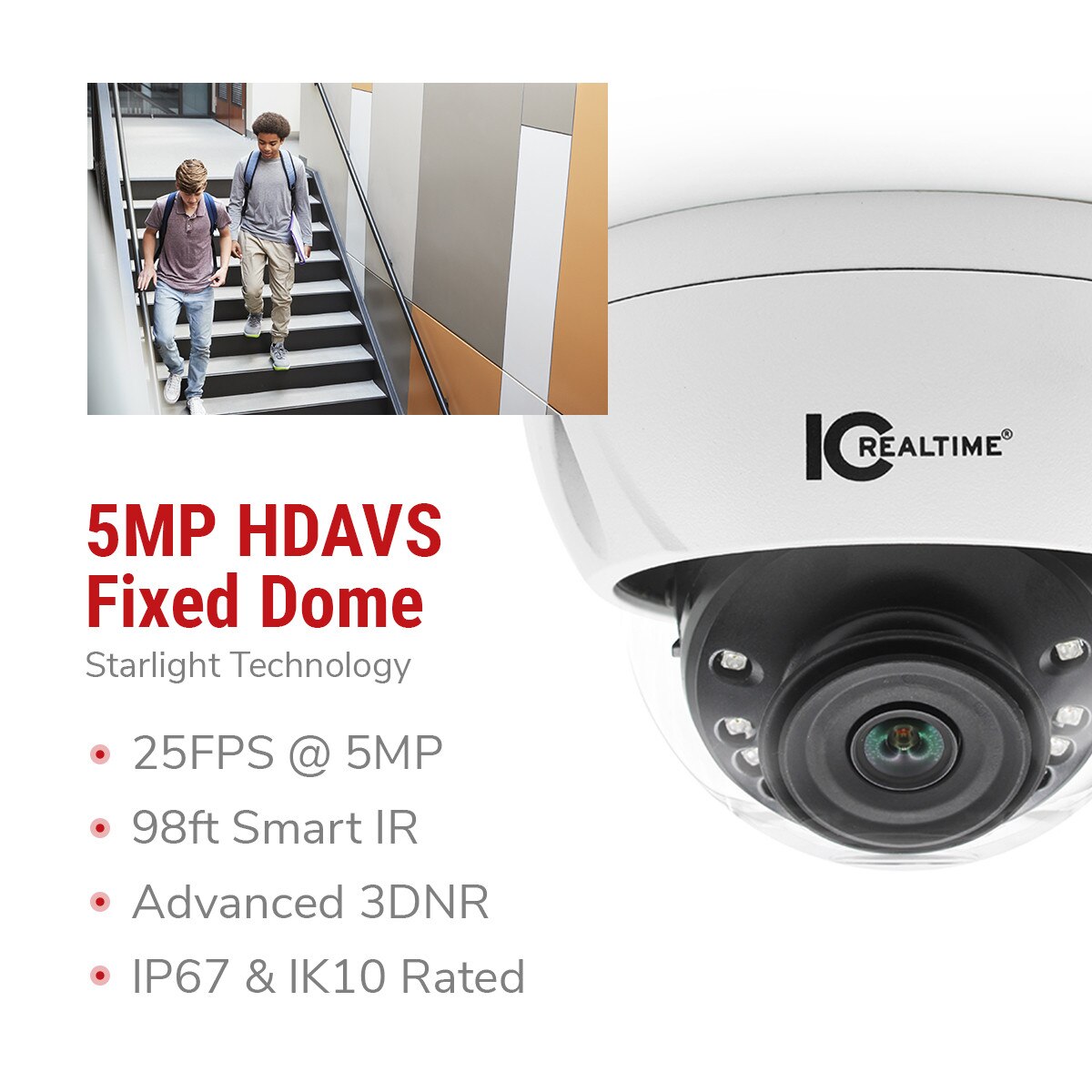 Dome security cameras represent the most vandal-resistant camera format in the industry due to their inherent "hard to grab" dome structure and "hard to damage" internal and protected camera mechanisms. IC Realtime's new 5MP HDEG-D50F-IR-M1 dome camera is not only our toughest 5MP Starlight coax dome; it’s a fixed 2.8mm medium wide-angle lens with a 132° AOV and Starlight darkness-defeating performance makes it one of our best and most cost-effective cameras ever.