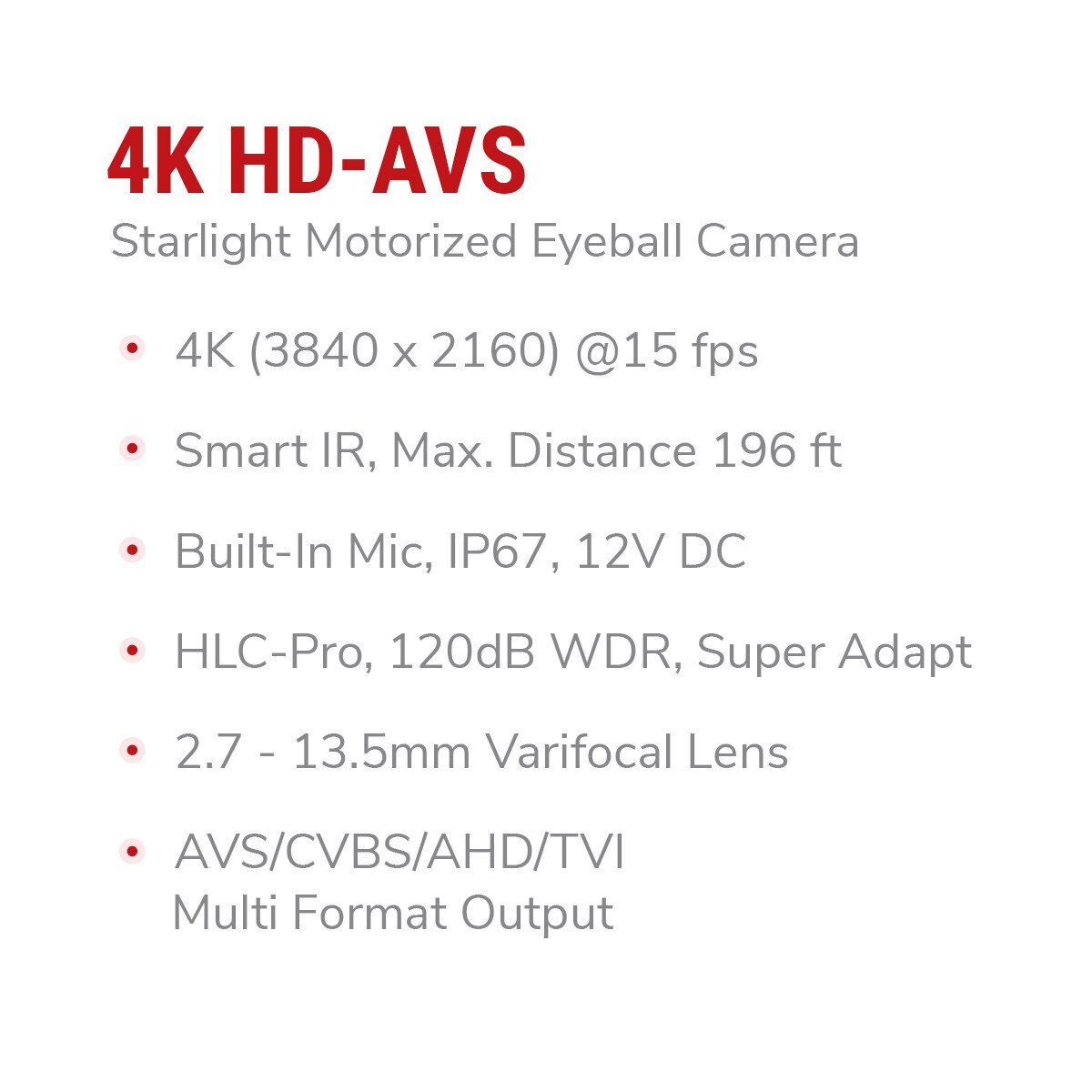 The HDEG-E80V-IRM1 features a motorized varifocal lens with a range of 2.7 mm to 13.5 mm, offering a customizable field of view from 114° to 32°. Powered by an 8MP 4K CMOS image sensor, the camera delivers stunningly detailed visuals at a resolution of 3840 × 2160 and a smooth frame rate of 15 fps. Compact yet robust, it measures 4.80" × 4.13" to fit seamlessly into a variety of installations.