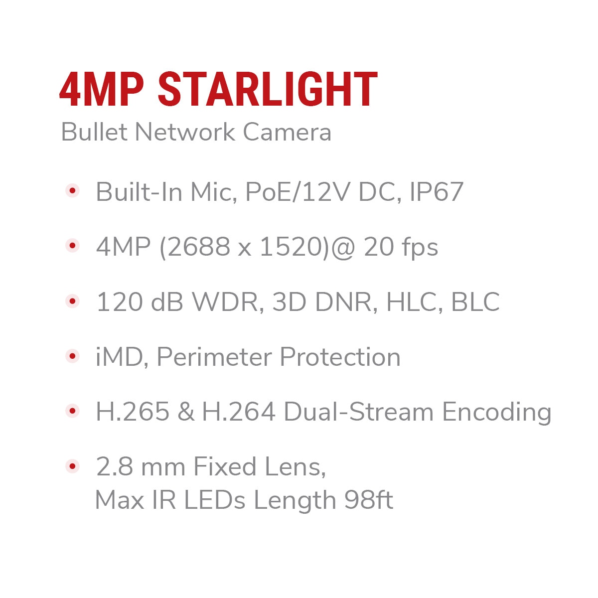 At the core of the IPEG-B40F-IRW3 is a 1/2.9" CMOS sensor capable of delivering crisp 4MP resolution at 30 frames per second. A fixed 2.8mm lens offers a 95° angle of view for wide coverage, while Smart IR enables up to 98 feet of night vision with balanced exposure and reduced glare. Equipped with 120dB Wide Dynamic Range and Backlight Compensation, this camera ensures high-quality imaging even in complex or harsh lighting conditions.