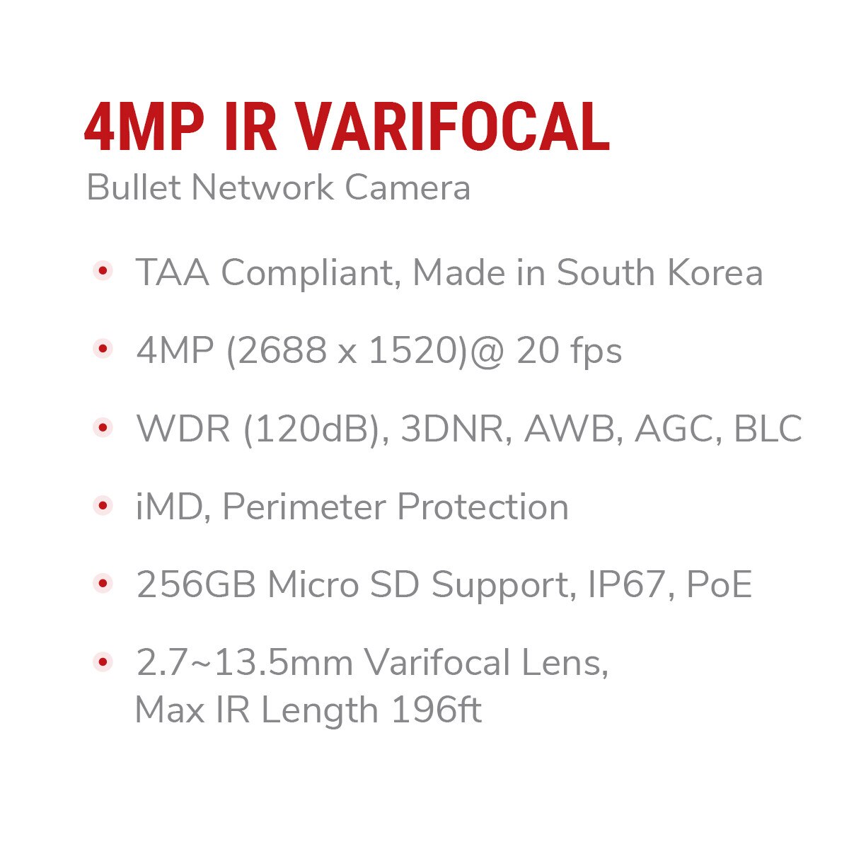At its core is a 1/2.9" CMOS sensor capturing sharp 4MP resolution at 30fps, enhanced by a motorized 2.7–13.5mm vari-focal lens offering a horizontal field of view from 104° to 29°. Whether you're zooming out for a broad scene or focusing in on distant subjects, the IPEG-B40V-IRW3 delivers clarity across the spectrum. Smart IR illumination with a reach of up to 196 feet ensures strong low-light performance, while 120dB Wide Dynamic Range and Backlight Compensation preserve detail in difficult lighting conditions.