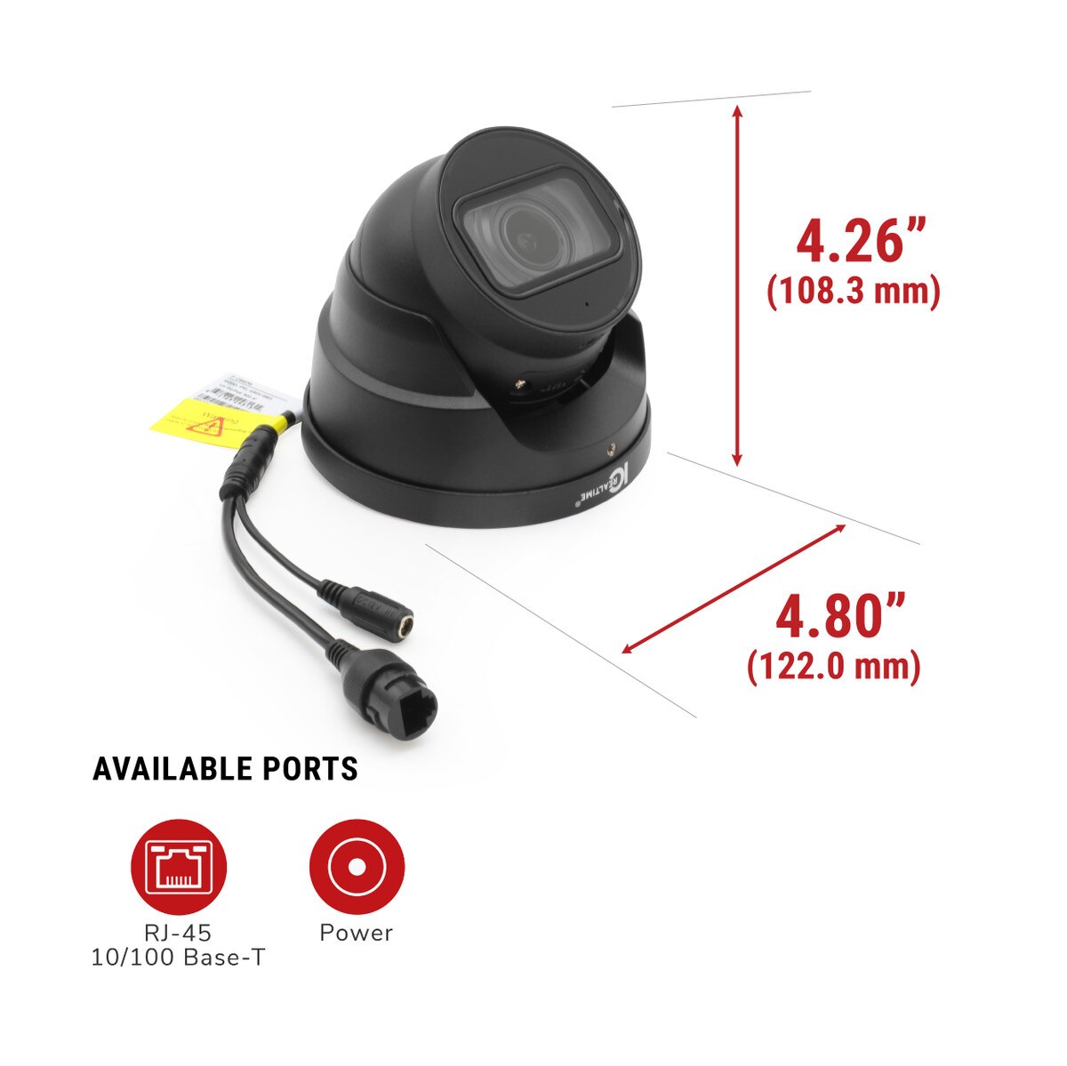 This Factory Black 4K eyeball dome features a 2.7mm – 13.5mm power zoom auto-focus lens, providing a zoom-variable 109°–30° horizontal FOV. Thanks to the camera's massive 2.8” Starlight video sensor with a pixel density of 8.292 million pixels, the IPEL-E80V delivers full 4K color streams even in low light conditions as dim as 0.007 lux. In complete darkness, its built-in Smart IRs illuminate up to 130+ feet, ensuring ultra-sharp grayscale imaging. At every zoom setting, the camera’s telephoto lens and 4K resolution deliver excellent DORI performance metrics.