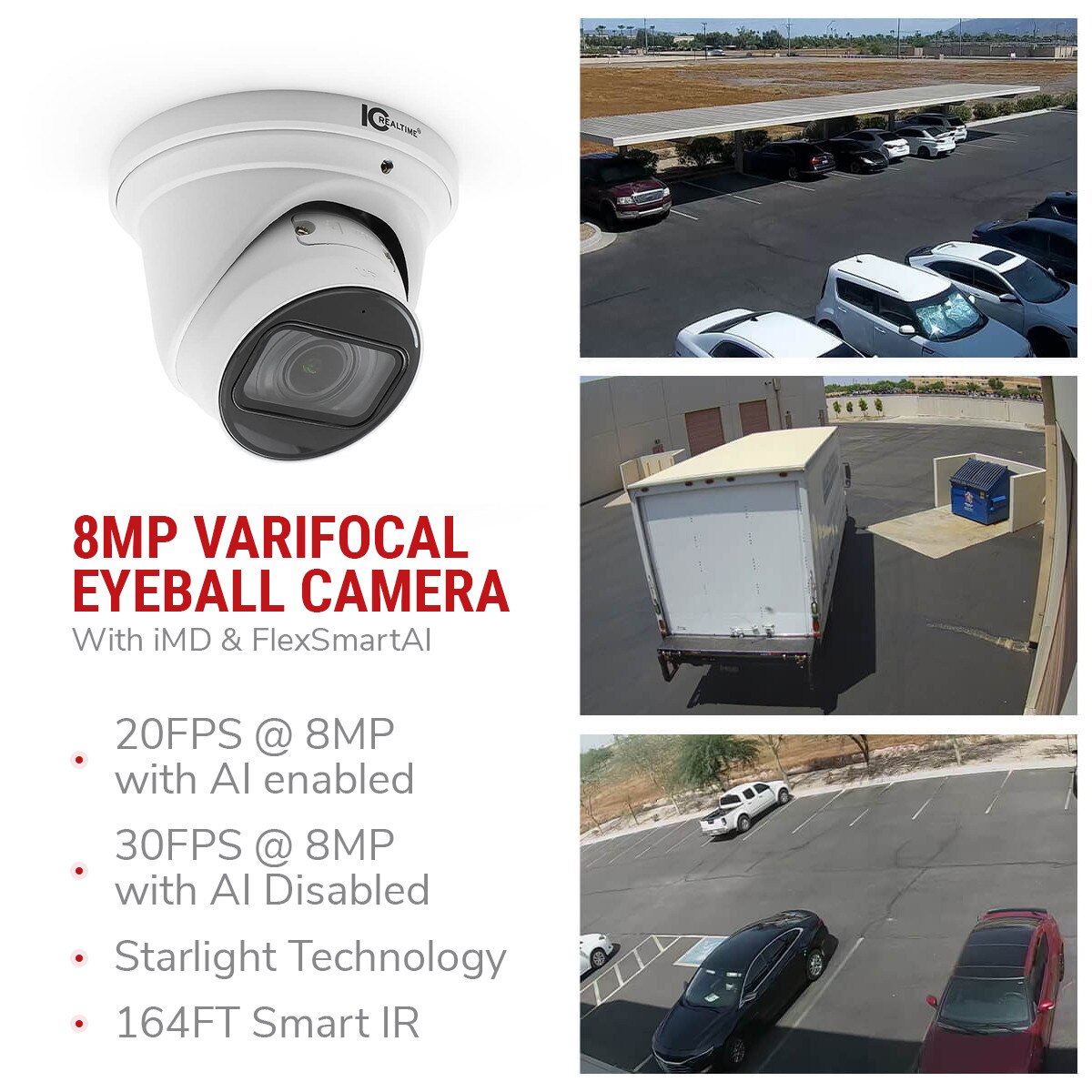 With ultra-high definition, video stream management becomes even more critical with 4K pixel density, so the FlexSmartAi E80V uses IC Realtime's H.265+ video stream compression. The "+" indicates a scene-adaptive video codec and uses a flexible multi-frame reference structure with intelligent noise reduction. What does all this mean? Streaming bit rates and storage requirements are reduced by up to 70% compared to standard H.265 to ensure high-speed video streaming with less network load.