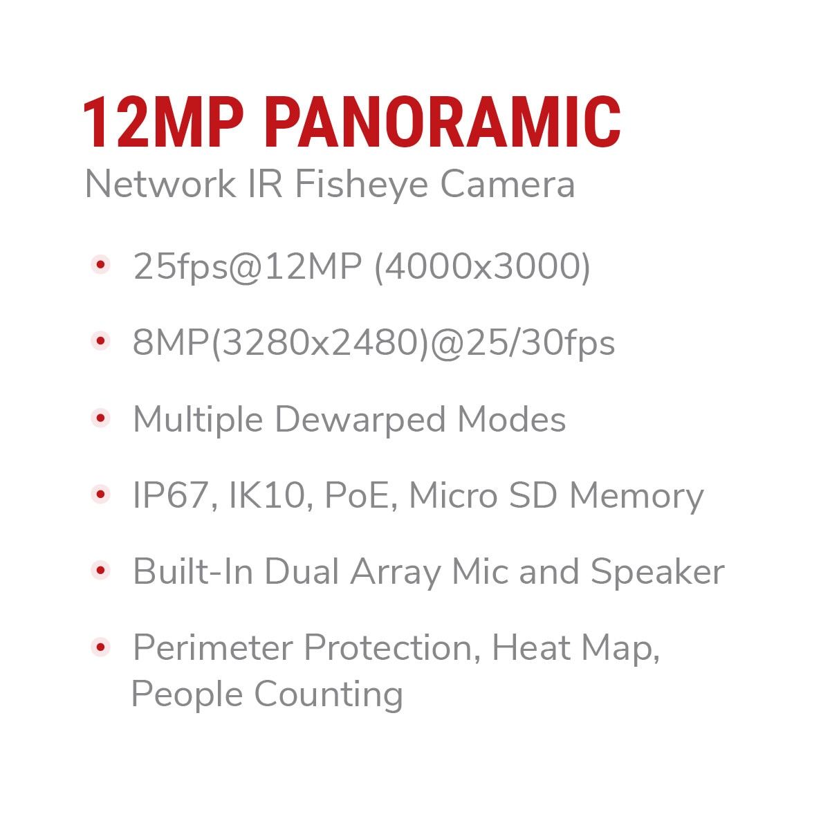 IPEL-F12F-IRW2's 12MP IR Fisheye network camera stream utilizes a densely packed 4000 x 3000-pixel video sensor. This density renders incredibly detailed native 360° fisheye views using the camera's 1.85mm spherical aspect fixed focus lens system, supplemented under 0.01 lux ambient light by 32+ feet of IR illumination. That ultra-detailed 360° stream is then electronically de-warped as desired into standard camera views for human observation & analysis - and for the camera's own even more unblinking & perceptive FlexSmartAI detection system.