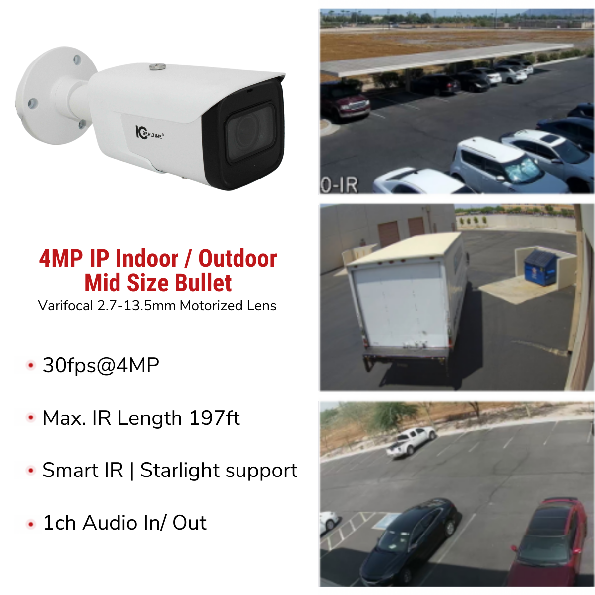 The IPFX-B40V-IRW2 is a 4MP bullet camera featuring our latest generation of 1/3’’ CMOS sensors and Starlight support with increased IR illumination up to ~197’. Housed in a weatherproof IP67 rated casing, the camera also includes H.265 encoding for optimized storage and AI functions such as Intelligent Motion Detect and Perimeter Protection, which recognizes vehicle and human targets enabling a refined Intelligent search using IC Realtime AI enabled NVRs.