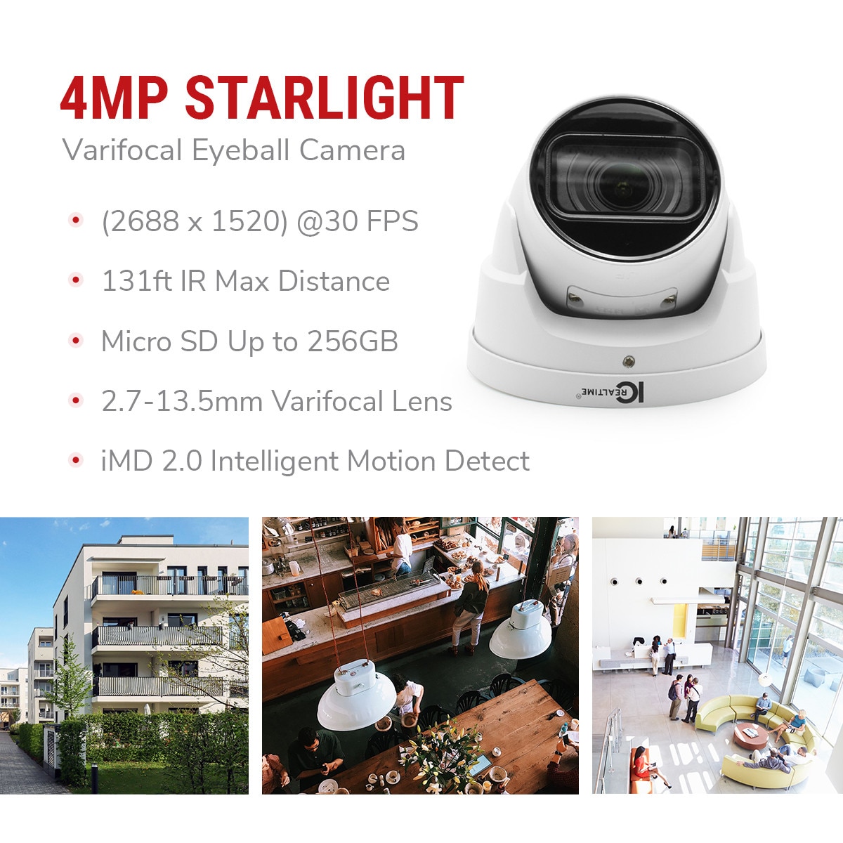 Like its predecessors, this IPFX-E40V brings a 2.7mm – 13.5mm power zoom auto-focus lens. With a zoom variable 104°–29° horizontal FOV it’s easy to dial in a perfect shot from the NVR's control panel or the IC View+ app. QHD 4MP with a Starlight sensor that streams in full color down to 0.005 with even the smallest amount of ambient light followed in total darkness by 130+ feet of Smart IRs for ultra-sharp grayscale night vision.