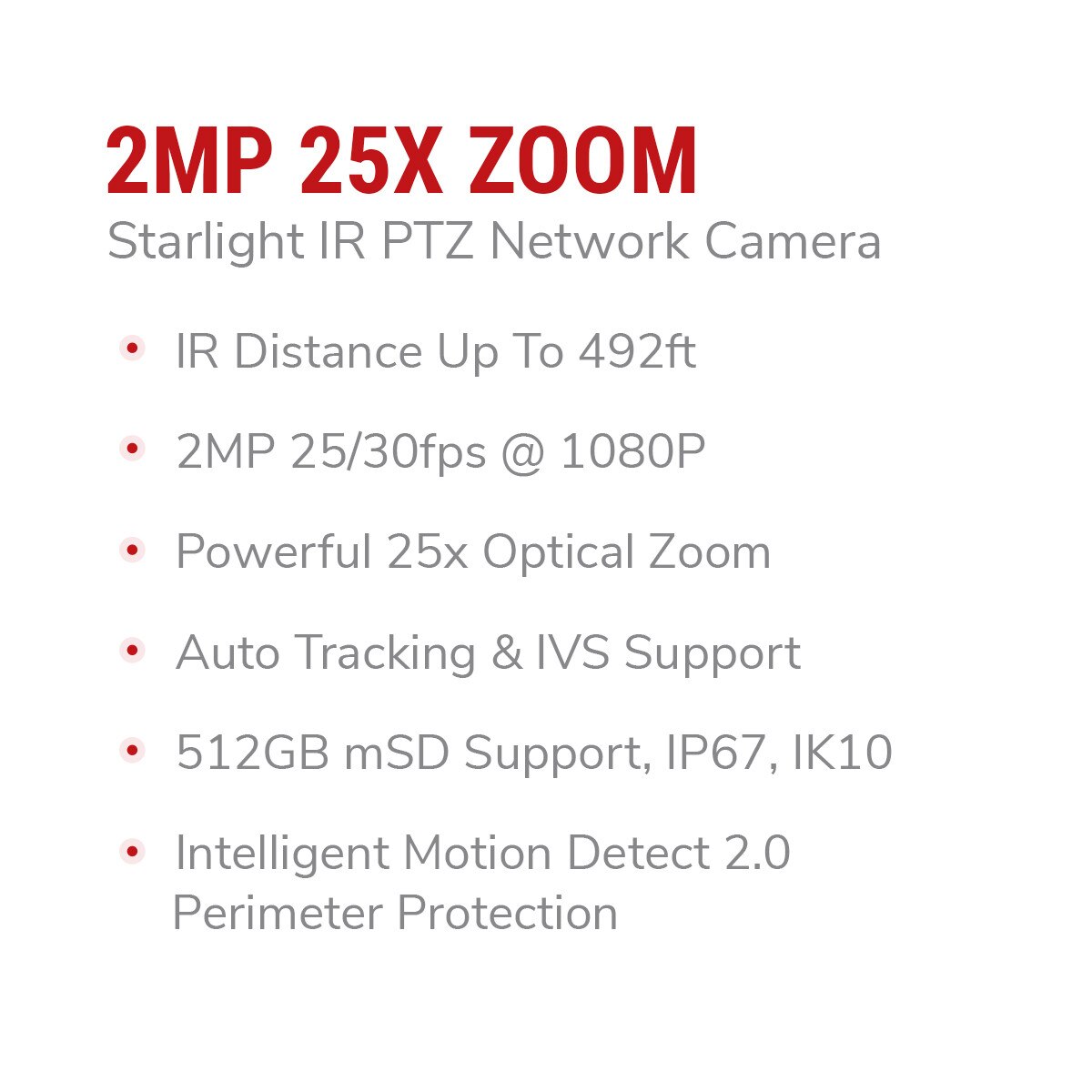 This PTZ also supports Intelligent Motion Detect 2.0 and Auto Tracking with IVS (Tripwire, Intrusion). It also includes other AI, such as Abandoned/Missing support, Parking Detection, and Face Detection. Other features include IP67 and IK10 protection and flexible AC 24V/ PoE+ power options.