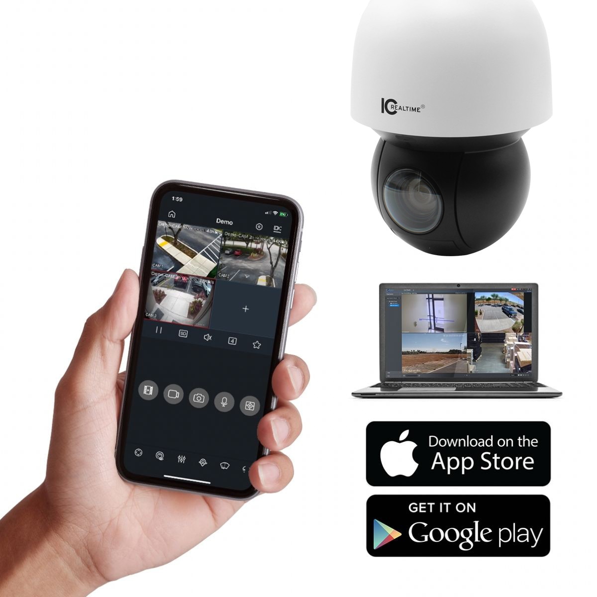 The camera also includes a 24VAC local power supply where 23W of PoE+ power is not available on the CAT5/6 network line. And for alarm integration, the camera has 2/1 alarm leads and will encode audio using its I/O ports - both co-located on the camera’s power & interface pigtail for easy installation. And, of course, it can use all IC Realtime’s PTZ mounts & mounting accessories, including the ability to hang directly on our massive & weatherproof MNT-Box 2 with copious internal space for wire & power connections.