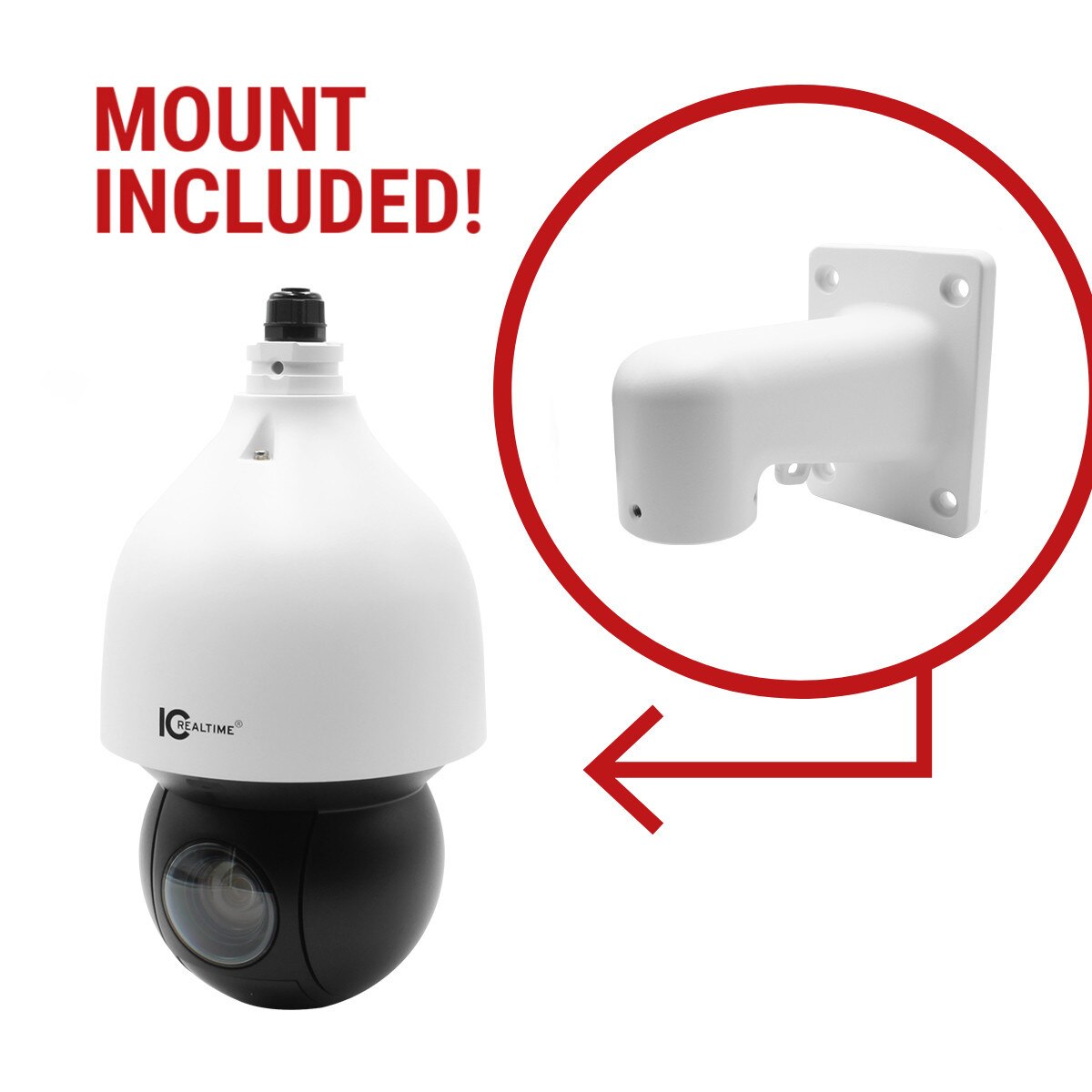 IPFX-P4032X-IRW2 utilizes the “black ball” effect that makes its camera movements & aiming point hard to discern for intruders, especially at night. The camera’s sun-bucking white mechanism shroud & tightly sealed metal “cam ball” is IK10 vandal-resistant and IP67 weather rated. The camera includes a cast metal wall mount bracket in the box and a 24VAC local power supply just in case 23W of PoE+ power is not available. Designed to be a team player and an easy upgrade for existing camera positions, IPFX-P4032X-IRW2 also sports 2/1 alarm leads and will audio I/O ports co-located on the camera’s power & interface pigtail. Although the box includes a standard wall mount arm, IPFX-P4032X-IRW2 is also designed to fit IC Realtime’s line of PTZ mounts for custom installations & legacy PTZ replacement.