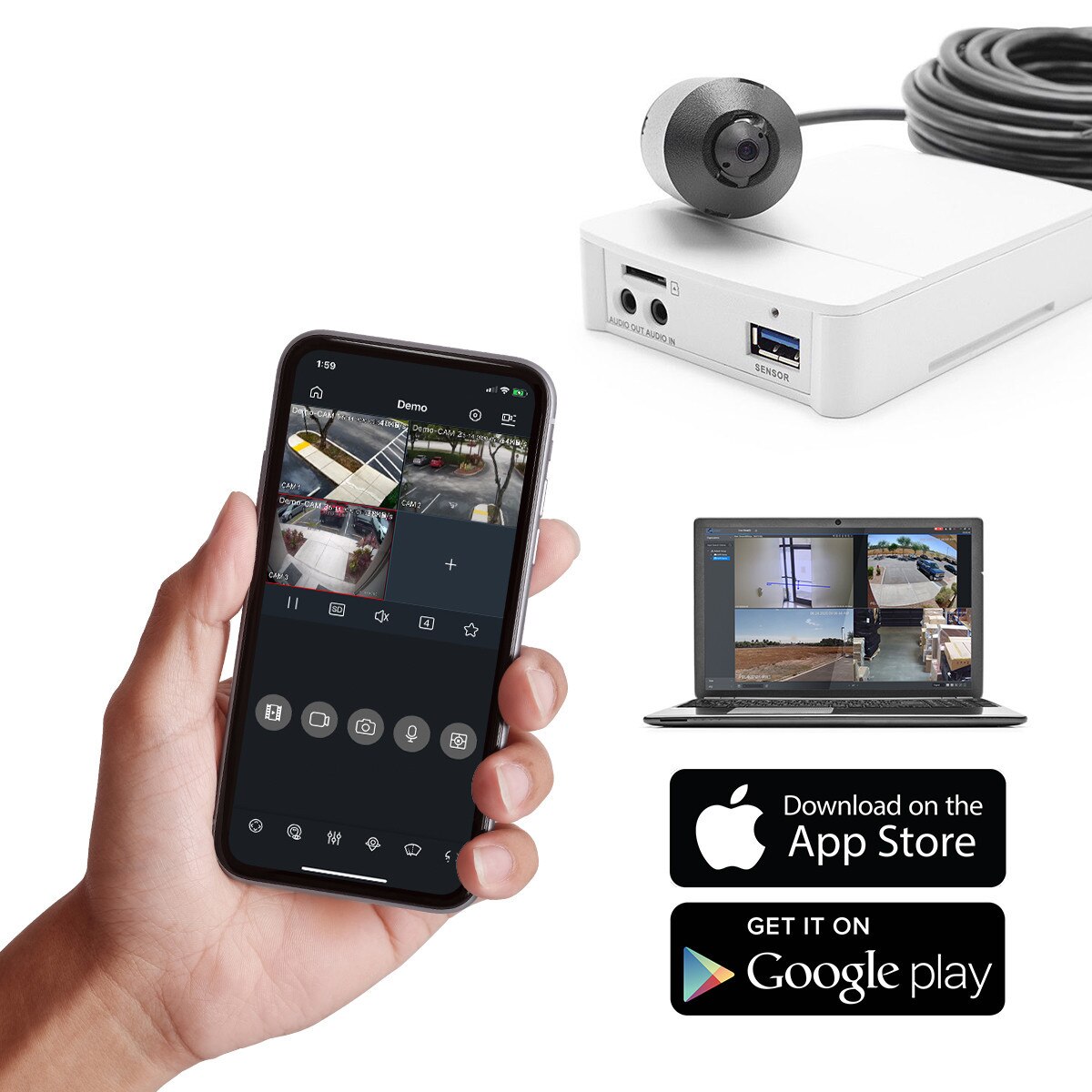 At precisely 4.33” ×3.26” ×0.95” this interface box is slightly larger than a deck of cards. The aluminum enclosure securely holds & provides heat sinking for the S20F’s advanced video processing and H.265 compression & video encoding boards, two-alarm in/out ports, front panel audio input & output ports (external audio is encoded within the IP video signal), and Net/PoE and 12VDC power ports. This base unit also houses a 128gb capacity SD card slot for local recording and an external reset button. To maximize its installation flexibility, the S20F can be locally powered by 12VDC where PoE power is not available, and the system is ONVIF, PSIA & CGI compatible.