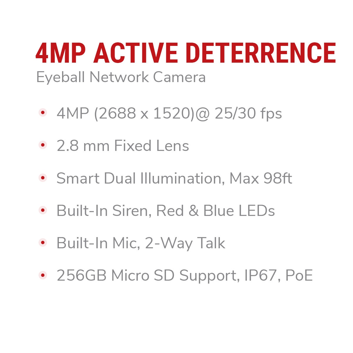 | Advanced Intelligent Functions: | Perimeter Protection: Tripwire; Intrusion (Supports the classification and detection of vehicle and human objects) Intelligent Motion Detect 2.0: Advanced secondary filtering for human and motor vehicle , reducing false alarms caused by leaves, rain and lighting condition change. Supports Object Search with compatible NVRs. |