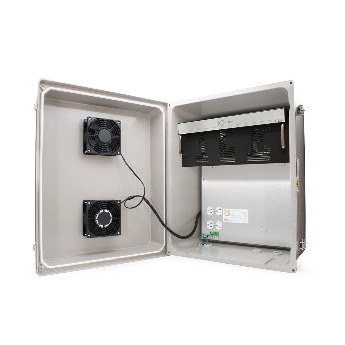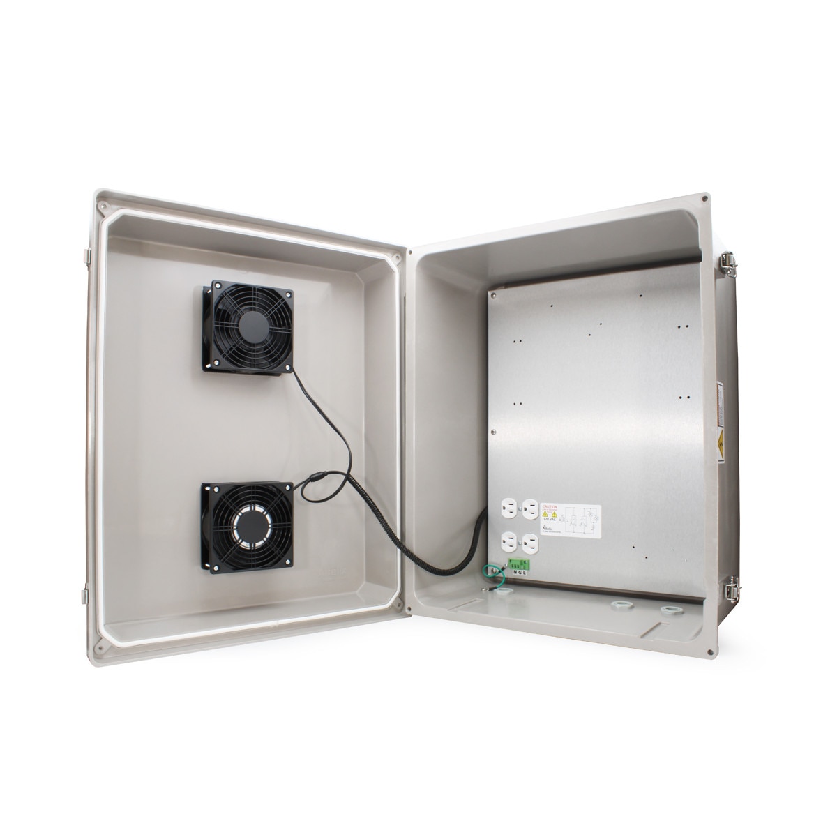 Climate-ready outdoor NEMA enclosure for recorders, networking devices, and power components. Dual thermostat-controlled cooling fans plus a 200W heater, pre-wired outlets, and extra interior clearance for demanding installs.