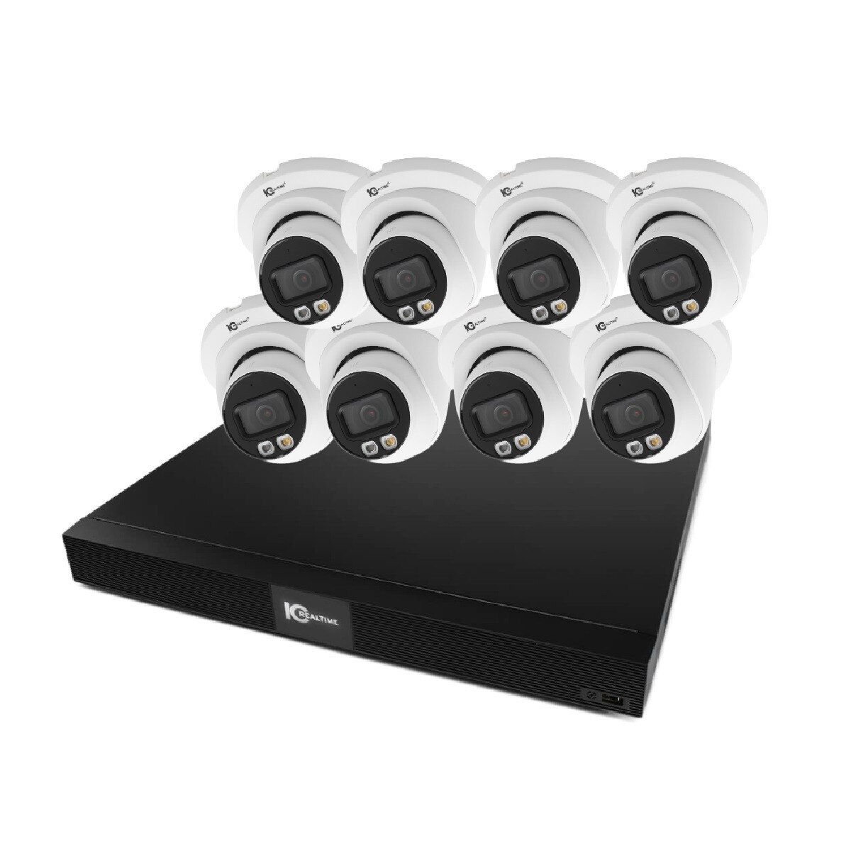 IC Realtime's new Nightwatch Pro AI bundles are designed for a seamless, stress-free installation, featuring carefully selected equipment for optimal performance. The NIGHTWATCH-PRO-AI-6ED-VFX bundle includes the NVR-VFX08POE-1U4K1 recorder with a pre-installed 4TB hard drive and eight IPEG-E40F-DIW1 cameras, ensuring high-quality surveillance. The built-in 8-port PoE allows for true plug-and-play connectivity, while the cameras feature Smart Dual Illumination Technology with both IR and White LED lights for enhanced visibility. These systems integrate smoothly with our IC Now software for Windows and Mac, as well as the IC View+ mobile app for iOS and Android. Backed by a 7-year warranty and U.S.-based tech support, these kits deliver reliability and peace of mind.