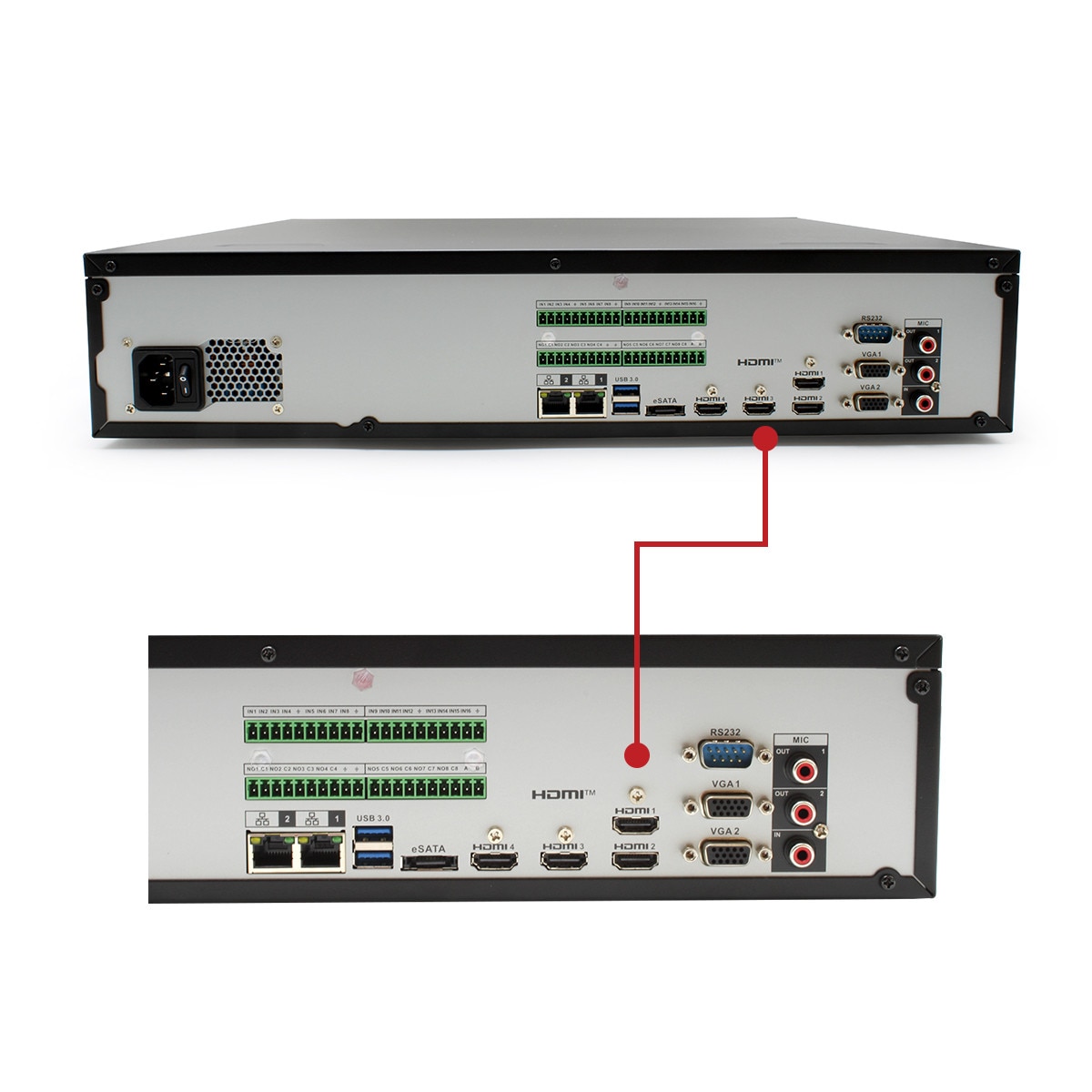 As a rack-mountable network appliance, NVR-EL32 is equipped with dual RJ-45 jacks on the backplane with port #1 reserved for NVR user network access to leave port #2’s bandwidth fully available for camera inputs from their remote POE switches for reduced latency. The backplane also includes 4 HDMI outputs for outputs up to 8K and a VGA port for local monitors, plus numerous interface ports including 16 low-level in & 8 programmable NO/NC alarm input ports, a set of RCA jack analog 2-way “talk back” audio in/out ports as well as an RS232 port for external PC comm.