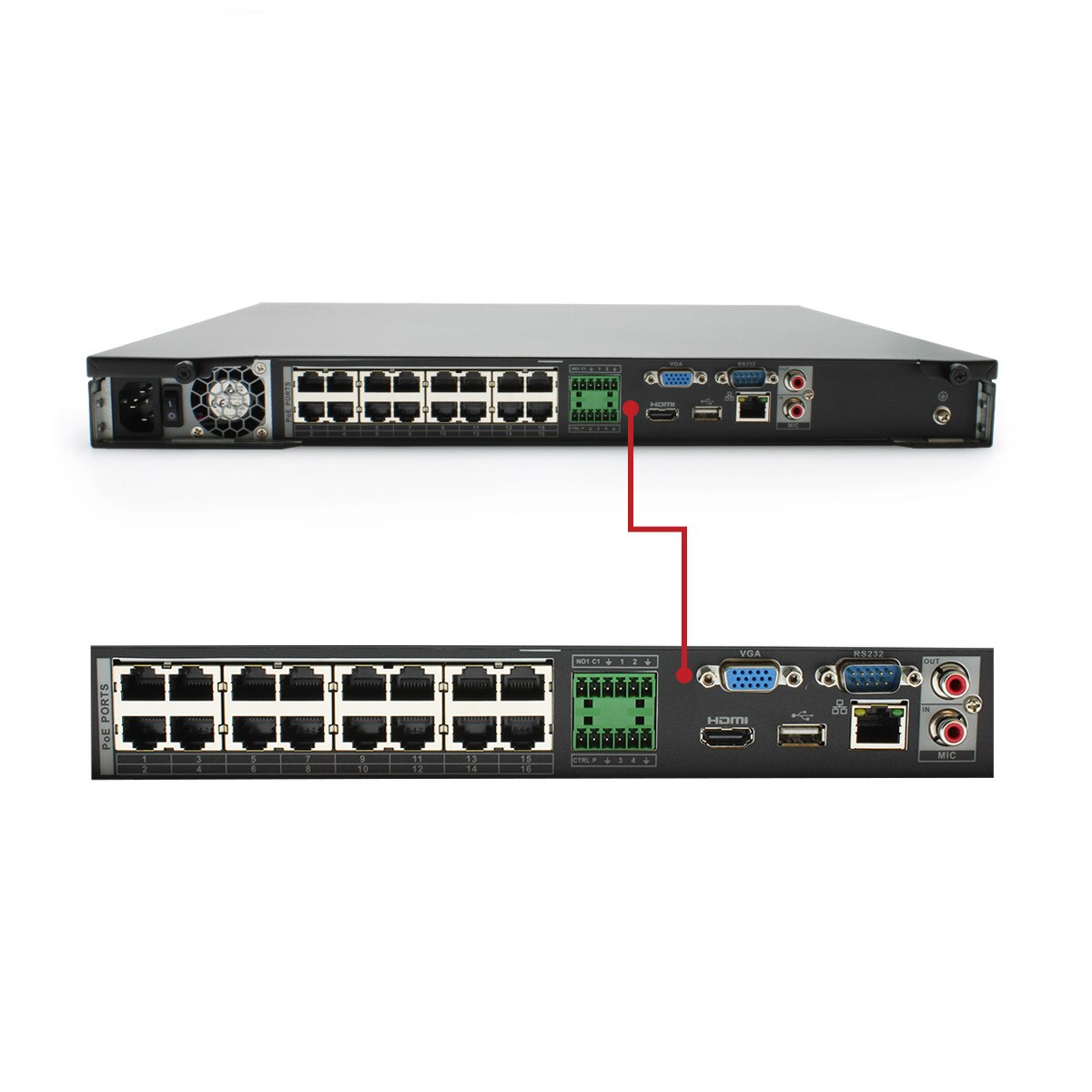 NVR-FX16POE-1U16MP1 is a compact yet sophisticated rack-mountable NVR with a built-in 16 port PoE switch embedded on its rear panel, eliminating the need for a separate POE camera switch, saving both money and rack space.