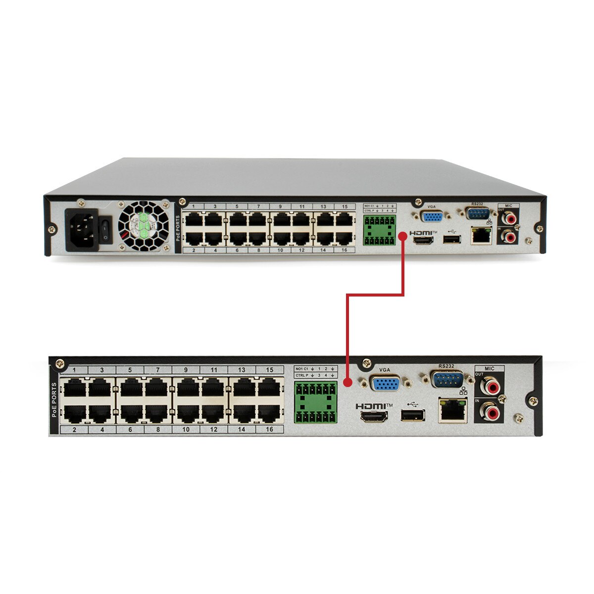 NVR-MX16POE-1U16MP1 is a compact yet sophisticated NVR with a built-in 16-port PoE switch embedded on its rear panel. This eliminates the need for a separate POE camera switch, saving money and rack space.