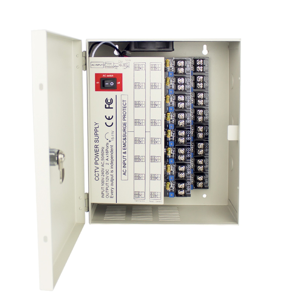 PS-DC32A16HD-4DK is a 16- channel 12v DC Power supply. This power supply provided constant 12VDC power to up to 16 cameras at 2 amps per channel with a ±5%A load rating and ≥82% efficiency. The internals are housed in a tough, lockable case.