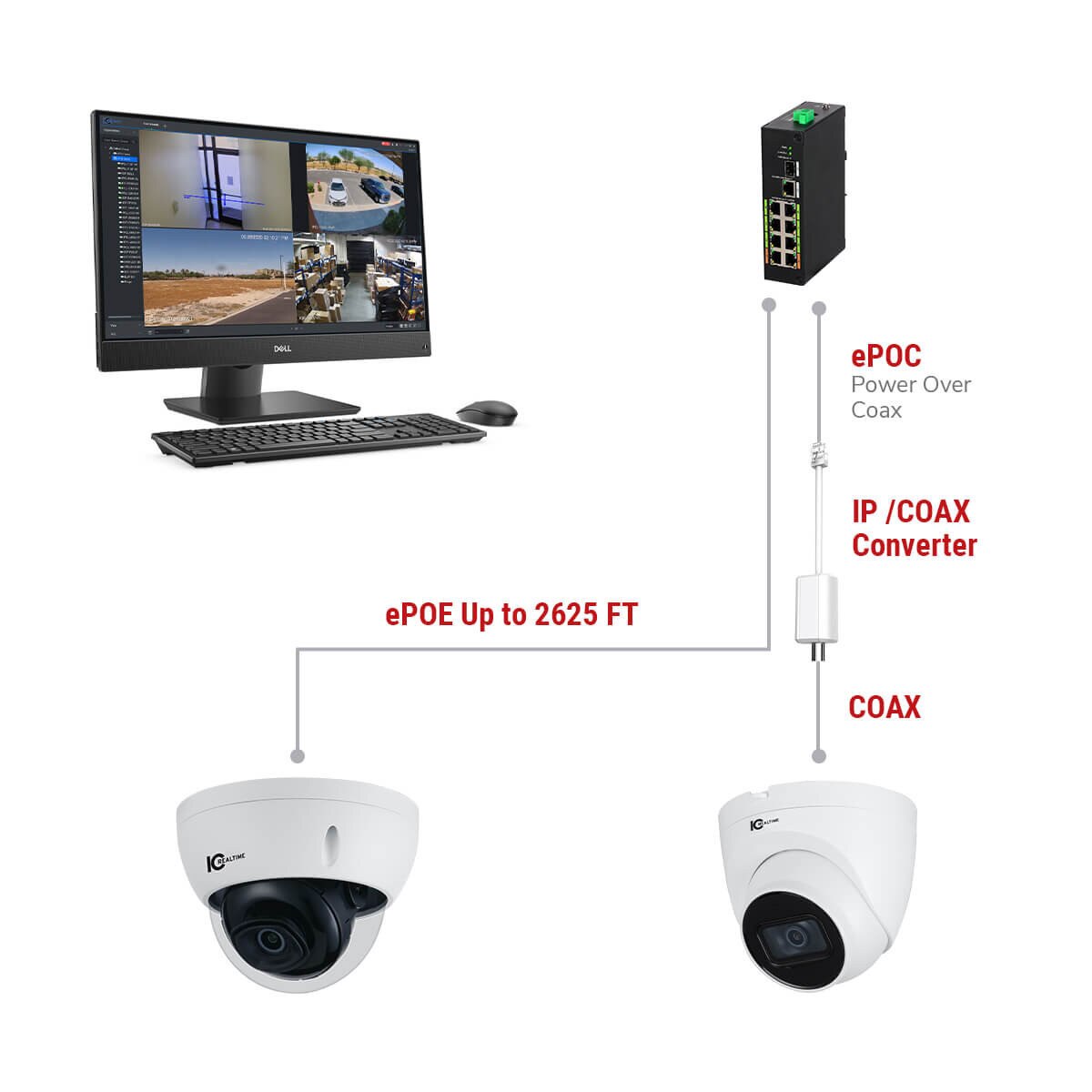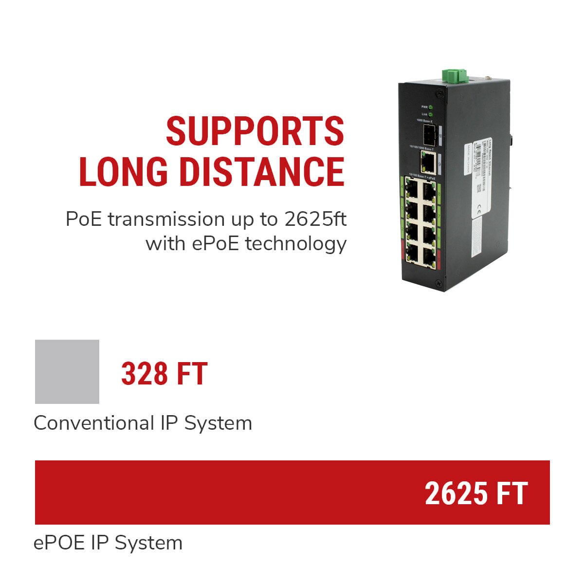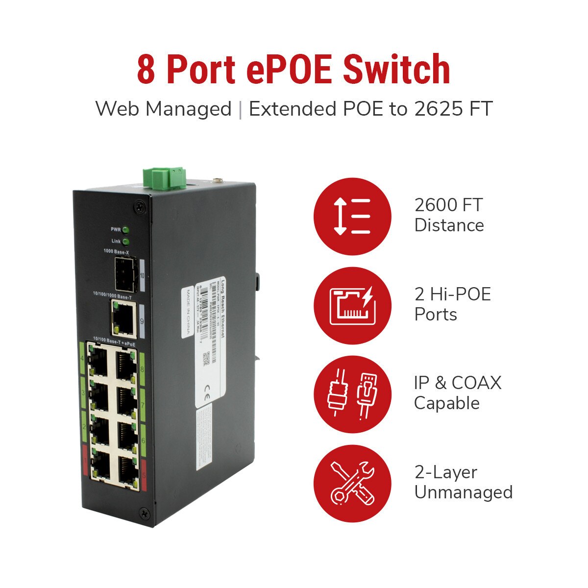 PWR-EPOE-8-V2 is IC Realtime’s latest version of our 8-port layer-two, unmanaged ePoE gigabit switch. The original version was designed to be a POE camera powerhouse in a compact format to support power-hungry devices out to up to 2624 feet (800M). As an unmanaged network switch, there is no need to spend time setting it up. Installers can “plug and play” PWR-EPOE-8-V2 immediately within your network. This 8 switch has built-in QoS services to ensure that the connected devices are working correctly. This eight-port gigabit switch is the ideal network & power source for ePoE rated cameras and supports both Hi-PoE and PoC power supply technology, simplifying camera system wiring. The new V2 version is even more powerful, with 90W HI-PoE is available on ports 1 and 5. And up to 30W on the other ports, for a total of 120W total output. LED port indicators display the status of transmissions and modes. The device is compact, industrial-grade, has rear-mounted rail mount hooks, and supports a wide operating temperature range. If you need an efficient, compact Hi-POE capable 8 port unmanaged switch, PWR-EPOE-8-V2 is your best bet.