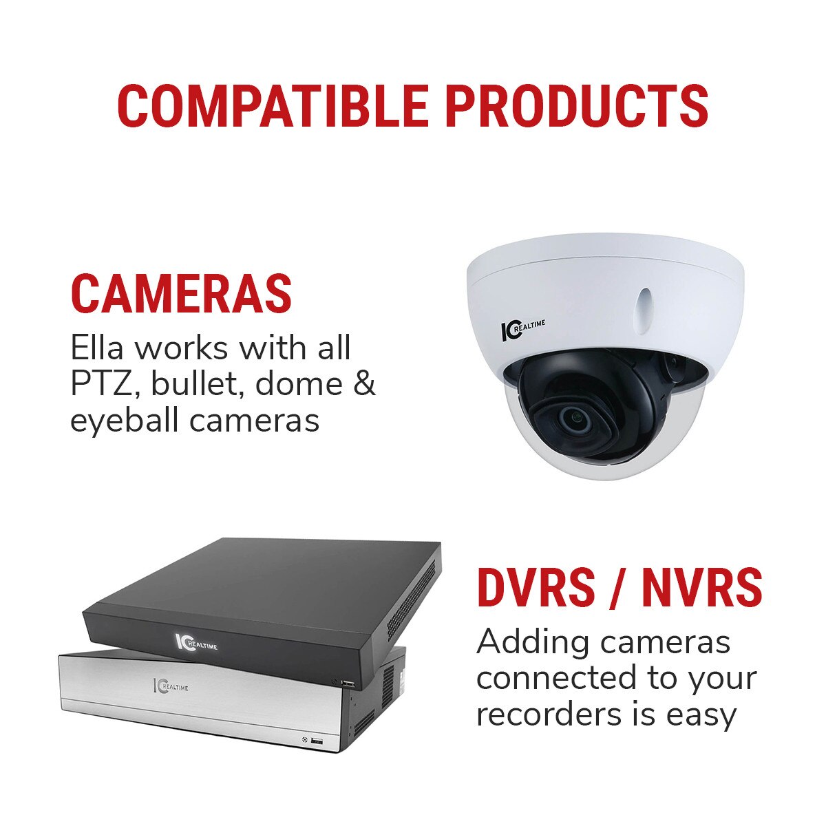 As part of IC Realtime's "video ecosystem," ellaPro is optimized to work with IC Realtime's cameras & recorders, but ellaPro also shares IC Realtime's cross-platform inclusive flexibility, so she works with all cameras, DVRs, NVRs, and VMSs that support standard H.264 RTSP video streams.
